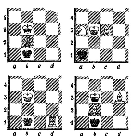 На диаграмме 12 дана позиция, в которой белый король мог уйти от шаха на поля d1, е2, f1. И можно было пойти белой пешкой с2 на поле c3, прикрывая белого короля от нападения черного слона b4.