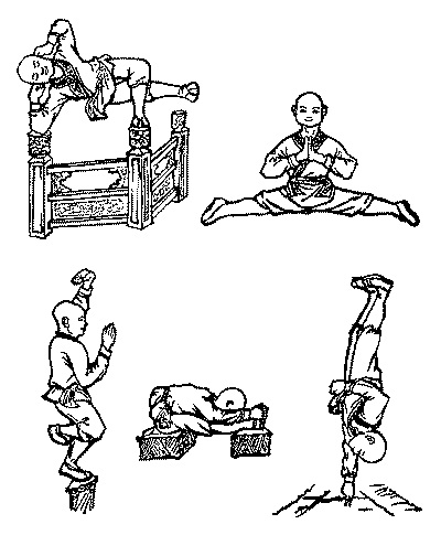 Первые позиции – сидя и стоя со сложенными перед грудью руками – предназначались для медитации, концентрации внимания и регулирования дыхания перед остальными, более сложными упражнениями. Упражнение «Ударить ногой в небо» предусматривало стойку на одной ноге, другую ногу следовало поднять к голове и полностью выпрямить так, чтобы стопа смотрела вверх. Другое упражнение, «Чаньское искусство двух пальцев», заключалось в стойке на одной руке на двух пальцах. Существовало более сложное упражнение – стойка на голове, когда ладони прижаты к бедрам. Это требовало не только великолепного чувства равновесия, но и серьезных достижений в практике нэйгун, потому что посредством одних лишь физических усилий такую позицию принять невозможно. Занимаясь «Искусством ребенка», монахи учились раскалывать камни ударом, удерживать равновесие в сложных позициях и многое другое.