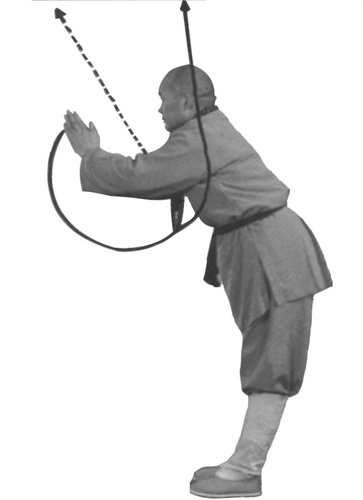 На медленном выдохе сделайте толкающее движение вперед на уровне груди, расстояние между ладонями – 10-15 см. В конечной фазе толчка немного наклоните корпус вперед, и, не распрямляя руки до конца в локтях, сделайте ладонями негромкий хлопок, резко закончив выдох. Взгляд – на ладони. Во время толкающего движения ладонями, сконцентрируйтесь на нижнем даньтянь.