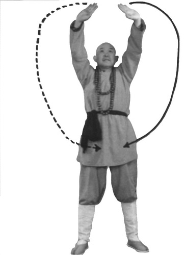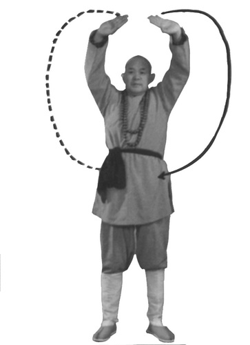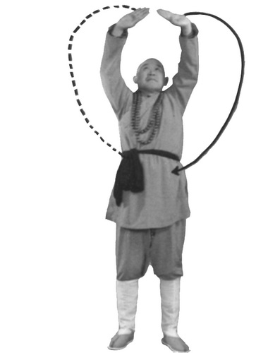 На вдохе подведите левую стопу к правой, приняв позицию бинбу. Одновременно кулаки раскрываются в ладони. Правую ладонь поднести к левой. Ладони поднять над головой и развести в стороны. Ладони развернуты центрами наружу. Пальцы направлены вверх. Взгляд – прямо. Концентрация на точке эчжун.