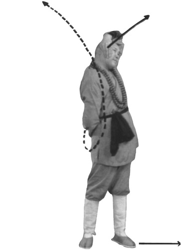 Делаем очень медленный выдох через рот, округлив губы (дыхание типа «ту»), одновременно ладони разворачиваются центрами вниз и медленно делают давящее движение вниз и немного в стороны, скользя вдоль внешних поверхностей бедер. Ноги сгибаются в коленях, образуя высокую стойку мабу. Грудь естественно расправлена, спина выпрямлена, однако при этом стремитесь не напрягать корпус. Движение ладоней остановить на уровне коленей. Кончик языка поднимается к верхнему небу. Глаза широко, но без напряжения, открыты, взгляд – вперед. Концентрируемся на точке соприкосновения языка и неба. В этом положении находимся одну минуту. Дыхание естественное.