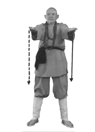 На вдохе ноги выпрямить в коленях. Одновременно центры ладоней развернуть вверх. Руки в локтях чуть согнуты. Ладони медленно поднять вверх с ощущением тяжести на ладонях и остановить на уровне груди. Руки чуть согнуты в локтях. Центры ладоней развернуты вверх. Пальцы направлены вперед. Взгляд – вперед.