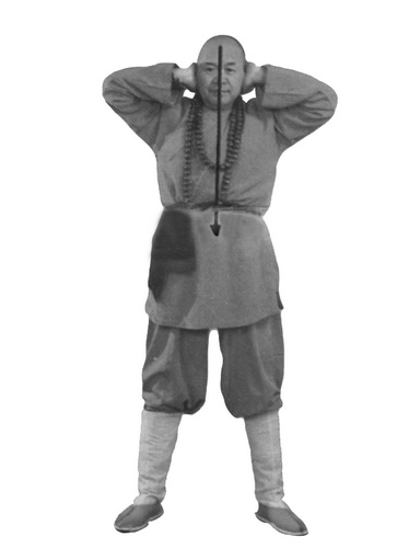 На выдохе выпрямите корпус. Одновременно локти сведите перед собой, центры ладоней развернуты наружу. Тыльные стороны ладоней прижимаются к шее, делают небольшое надавливание на боковую поверхность шеи и затем медленно опускаются вниз перед собой. На уровне груди ладони немного разводятся, центры ладоней разворачиваются вверх, предплечья опускаются к нижней части живота. Плечи расслаблены. Руки прижаты к корпусу. Центры ладоней направлены вверх. Взгляд – вперед.