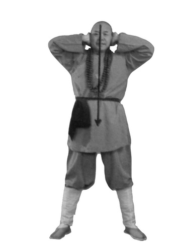 На вдохе сделайте левой ногой полшага влево – в сторону. Ладони через стороны поднимаются вверх до уровня плеч, после чего руки сгибаются в локтях, ладони подносятся к голове. Наложите ладони на уши, как бы закрыв ими уши, основание ладони находится на уровне височной части головы, центры ладоней – на уровне уха. Локти разведены немного в стороны. Взгляд направлен вперед.