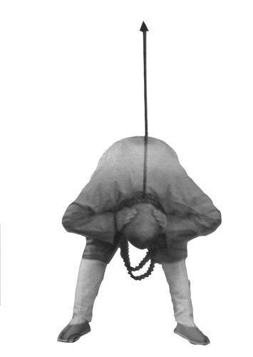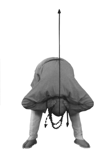На выдохе (выдох через рот, губы округлены) сделайте пальцами рук несильное надавливание на затылочную часть головы. Медленно наклоните корпус вперед, спина расслаблена, ноги выпрямлены в коленях. Наклонитесь таким образом, чтобы голова оказалась на уровне нижней части бедер или голеней. Концентрация на кончиках локтей. Взгляд направлен на стопы. В этом положении следует находиться 30 секунд.