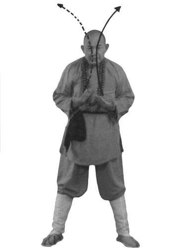 На вдохе ладони медленно поднимите вверх, центры ладоней направлены вверх, одновременно пятки оторвите от земли. Предплечья поднимите на уровень груди, руки согните в локтях, предплечья прижаты к корпусу. Центры ладоней развернуты вверх. Взгляд – вперед.