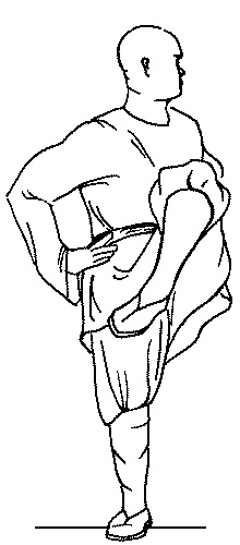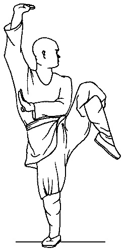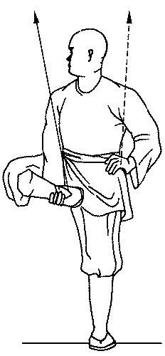 В позиции бинбу поднимите ногу, согнутую в колене, так, чтобы голень была параллельна полу. Одноименной рукой возьмите стопу обратным хватом изнутри и выпрямите ногу вертикально вверх. Одновременно другой рукой выполните движение лянчжжан. Носок поднятой ноги оттянут к себе. Опорная нога выпрямлена. Спина прямая.