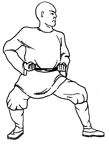 Выполнение: в стойке мабу на счет «раз» левая нога, с одновременным разворотом стопы, отводится в сторону на линию движения (стойка баньмабу), на счет «два» – разворот бедра с одновременным переносом веса тела на впередистоя-щую ногу (гунбу), на счет «три», не поднимаясь, подносим правую ногу к середине стопы левой (динбу), на счет «четыре» разворачиваемся на левой ноге влево на 90 градусов, одновременно правую ногу переносим (ступней вперед) по направлению движения (мабу) и т.д. Другой вариант: динбу – пубу – гунбу – диньбу – пубу – гунбу и т.д.