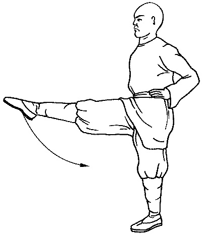 Из исходного положения (позиция бинбу, руки на поясе) выполните скрестный шаг правой ногой влево. Левую ногу согните в колене и поднимите вверх. Выполните удар в сторону активным разгибанием бедра и голени левой ноги. В конечном положении корпус и выпрямленная нога должны находиться в одной плоскости. Взгляд направлен в сторону удара. Точка приложения силы – подошва стопы или пятка. При ударе делается выдох, напрягая низ живота.