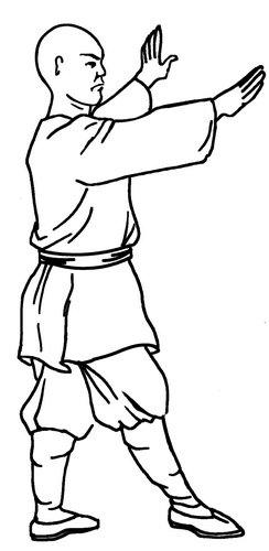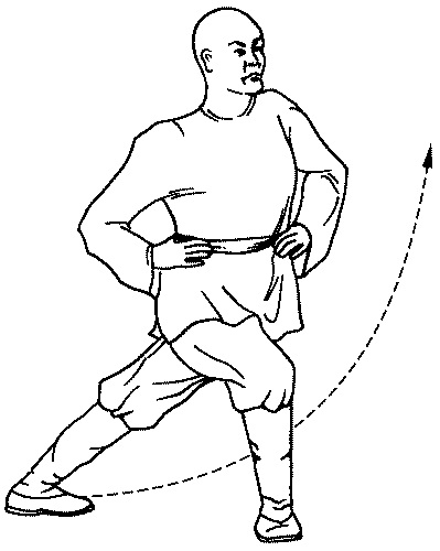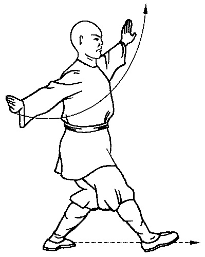 ноги отрывается от земли, спина согнута, ладонь сложена лодочкой, корпус, сгибаясь в пояснице, идет к ноге, руки после постановки правой ноги на землю остаются перед собой.ПОРЯДОК ВЫПОЛНЕНИЯ