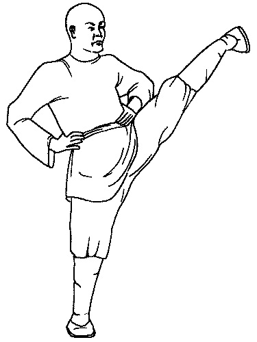Из позиции бинбу сделайте шаг вперед правой ногой. Одновременно левой рукой выполните мах вперед-вверх, а правой – назад-вверх. Левой ногой выполните мах вверх, одновременно правую руку отведите в положение на пояс и выпрыгните вверх толчком правой ноги. В верхней точке прыжка одновременно выполните движение дэнтуй правой ногой и движение туйчжан левой рукой. В момент выполнения удара левую ногу согните в колене, а правую руку сожмите в кулак и отведите на пояс. Приземлитесь на обе ноги и примите позицию бинбу.