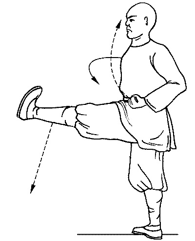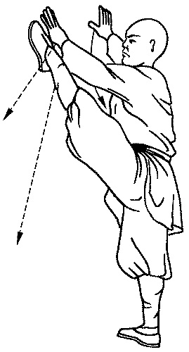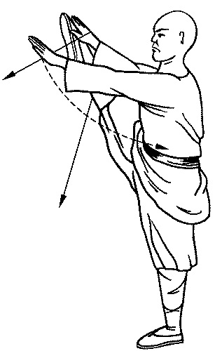 шаг вправо правой ногой, переместите вес тела на правую ногу и примите позицию цэтисипинхэн. Одновременно выполните удар пальцами правой руки на уровне колена. Взгляд направлен на кисть правой руки (рис. 71).71