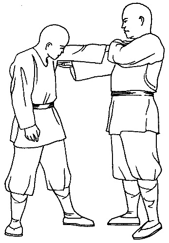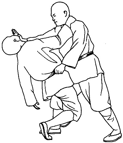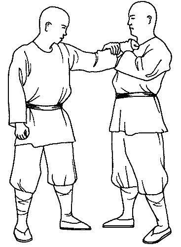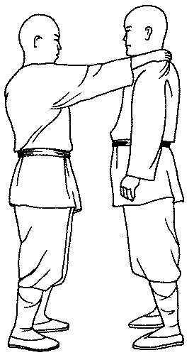 Противник схватил вас за правое плечо. Согните правую руку в локте так, чтобы рука противника находилась с внешней стороны правой руки (рис 1). Левой рукой выполните захват за левое плечо противника (рис 2). Сделайте шаг вперед левой ногой (рис 3) и одновременным движением выполните своей левой ногой зацеп левой ноги противника, левой рукой выполните толчок противника в направлении назад-вправо (рис 4, 5). Когда противник окажется на земле, выполните удар сверху вниз правой ногой в горло противника (рис 6).
