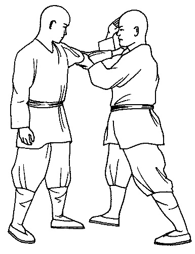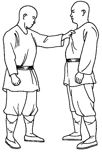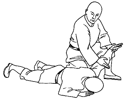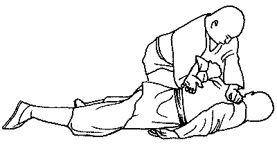 Противник схватил вас за одежду на уровне груди (рис 1). Выполните захват кисти противника обеими руками и надавите большими пальцами и основанием ладоней на его кисть (рис 2). Сделайте шаг правой ногой вправо, продолжая давление на его кисть (рис 3), пока противник не упадет и выполните удержание (рис 4).