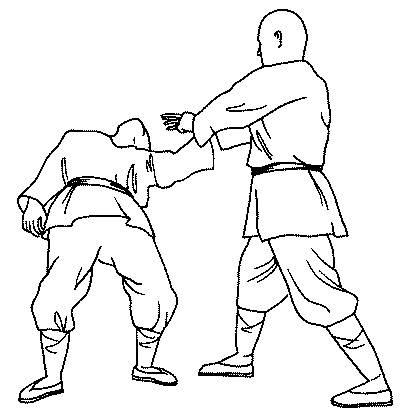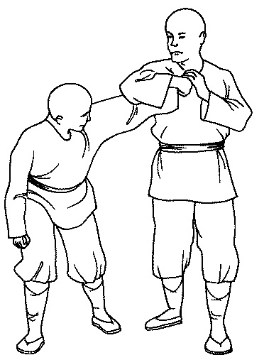 Противник схватил вас за правое плечо (рис 1). Сделайте шаг левой ногой вправо и разверните корпус влево. Одновременно поднимите правую руку вверх так, чтобы рука противника находилась с внутренней стороны правой руки (рис 2). Согните правую руку в локте и выполните резкий удар локтем вниз (рис 3). Выполните захват обеими руками за плечи противника, притяните противника к себе и выполните резкий удар коленом в пах противника левой ногой (рис 4).