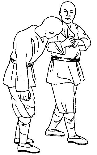 Противник схватил вас за правую руку в области локтя (рис 1). Резко согните правую руку в локте, прижимая к себе кисть противника в области локтевого сгиба. Одновременно выполните захват левой рукой за левое плечо противника (рис 2). Притяните противника к себе и одновременно выполните удар левым коленом в солнечное сплетение противника (рис 3).
