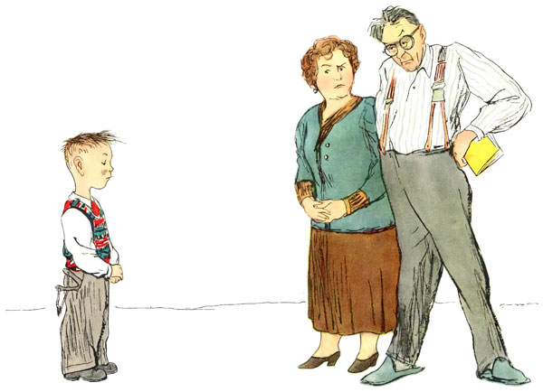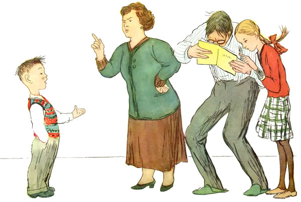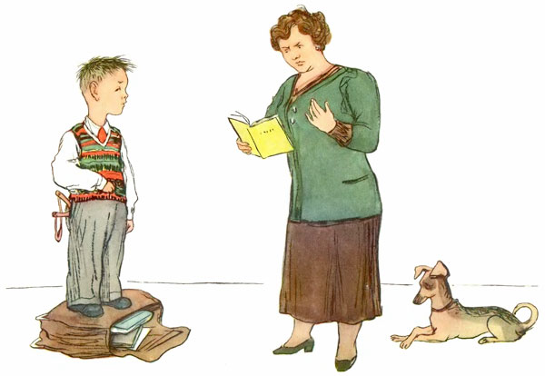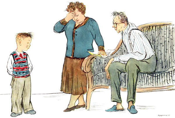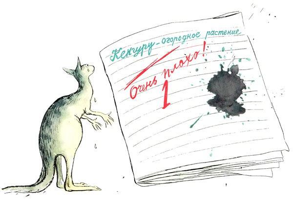 — За это, — мать сказала строго, —И единицы слишком много!— У нас отметки меньше нет! —Промолвил мальчик ей в ответ.— За что вторая единица? —Спросила старшая сестрица.— Вторую, если не совру,Я получил за кенгуру.Я написал в своей тетрадке,Что кенгуру растут на грядке! Отец воскликнул: — Крокодил,За что ты третью получил?!— Я думал, что гипотенуза —Река Советского Союза.— Ну, а четвёртая за что? —Ответил юноша: — За то,Что мы с Егоровым ПахомомНазвали зебру насекомым.— А пятая? — спросила мать,Раскрыв измятую тетрадь. — Задачу задали у нас.Её решал я целый час,И вышло у меня в ответе:Два землекопа и две трети.— Ну, а шестая, наконец? —