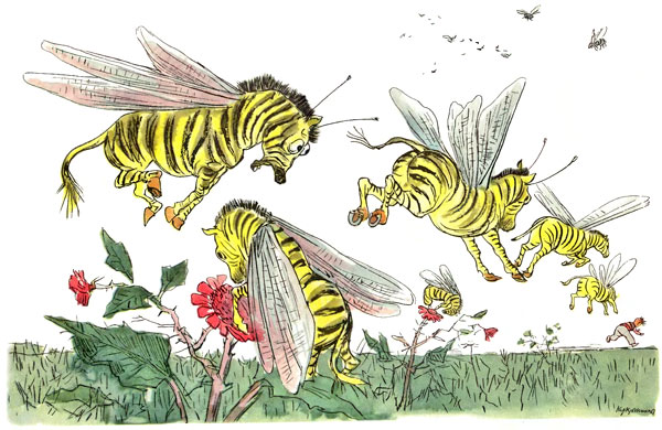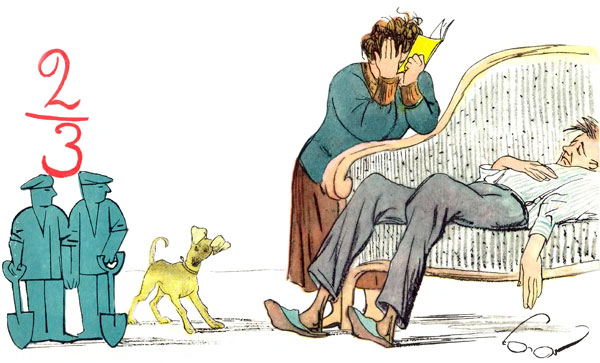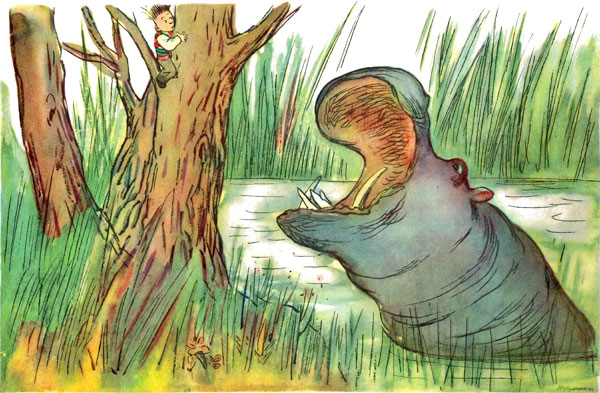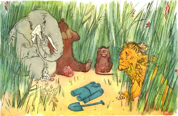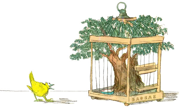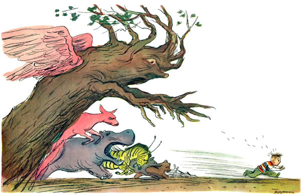 я не знал, который Канин,И указал на свой и Ванин…— Ты очень скверный ученик, —Вздохнув, сказала мать.—Возьми ужасный свой дневникИ отправляйся спать! Ленивый сын поплёлся прочь,Улёгся на покойИ захрапел. И в ту же ночьУвидел сон такой.Жужжали зебры на кустахВ июльскую жару.Цвели, качаясь на хвостах,Живые кенгуру.В сыром тропическом лесуЛовил ужей и жабНа длинном Канином носуКрылатый баобаб. А где-то меж звериных троп,Среди густой травы…Лежал несчастный землекопБез ног, без головы.На это зрелище смотретьНикто не мог без слёз.— Кто от него отрезал треть? —Послышался вопрос.— От нас разбойник не уйдёт.Найдём его следы! —Угрюмо хрюкнул бегемотИ вылез из воды. — Он не уйдёт из наших лап! —Добавил баобаб…Вскочил с постели ученикВ шестом часу утра.Пред ним лежал его дневникНа стуле, как вчера…