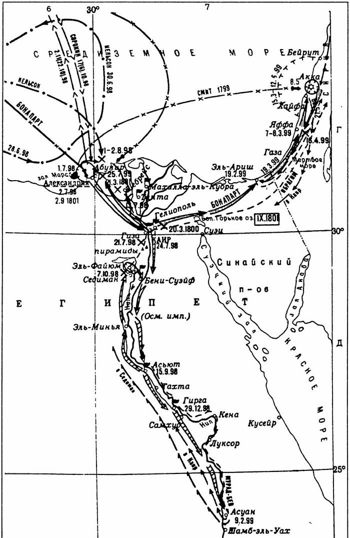 Сопутствуемый благоприятным ветром уже 30 июня Бонапарт со своим флотом подошел к берегу Египта близ Александрии и немедленно начал высадку войск. Положение было опасное: он узнал, что за двое суток до прибытия французов здесь уже побывал Нельсон.