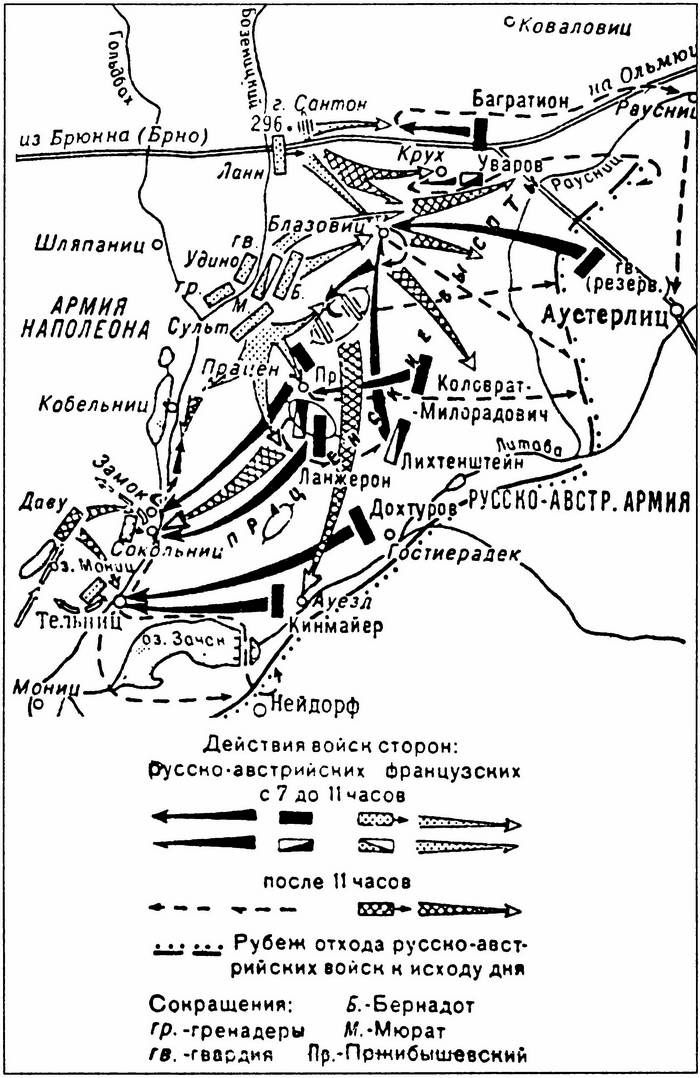 удара.Этим просчетом воспользовался Наполеон и перешел от обороны к наступлению. Корпус Сульта атаковал оставленные противником высоты и фланг колонны Коловрата. Удар по центральной позиции союзников был ошеломляющим. Французы вынырнули из тумана и под треск барабанов бросились к Працену. Союзники были застигнуты врасплох. Вскоре французы оказались у подножия высот, поднялись по склону и оказались на вершине. Вскарабкавшись наверх и оказавшись в пределах досягаемости неприятеля, они дали залп и бросились в штыки. Центр союзников рассыпался мгновенно, войска смешались, кавалеристы наезжали на пехоту, давили ее и она под натиском французов откатывалась назад.