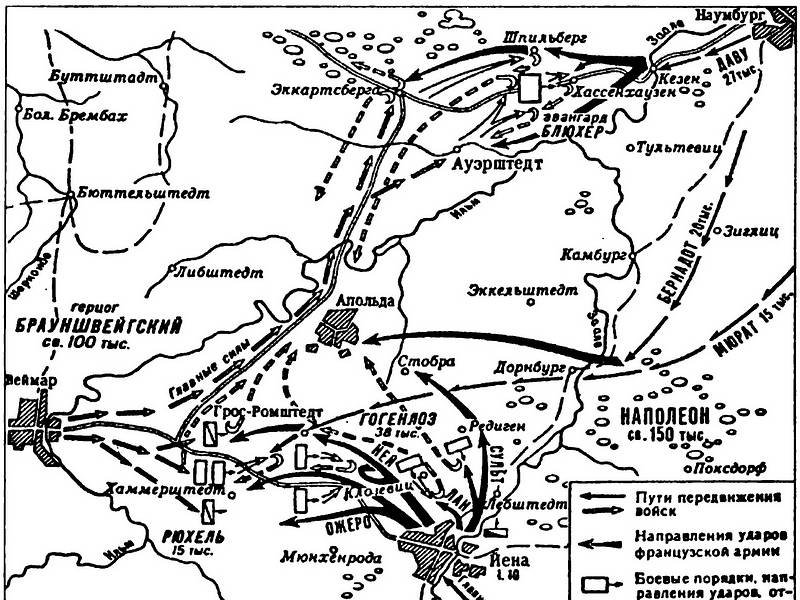 13 октября Даву уже занял Наумбург. Вечером того же дня главные силы Наполеона вошли в Йену, которая еще 11-го числа была очищена немцами в результате анекдотичного события. Несколько выздоравливающих солдат, находившихся на излечении в городском госпитале, решили совершить загородную прогулку. Их больничные колпаки издали кому-то напомнили французские кивера. Мгновенно в городе распространился слух о появлении французов. Побросав оружие, прусские полки начали разбегаться, покинув свою артиллерию и обозы.