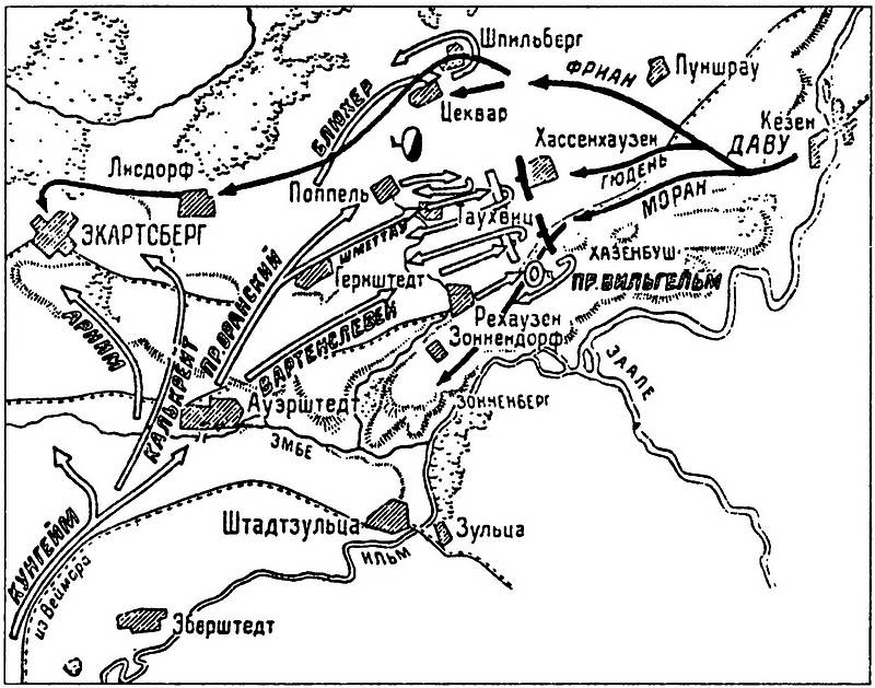 И поэтому, когда 14 октября в 6 часов утра прусские войска двинулись дальше на север, то в густом тумане совершенно неожиданно наткнулись на корпус маршала Даву, который по приказу Наполеона вышел из Наумбурга, чтобы зайти в тыл врагу. Французы успели по Кезенской переправе перейти реку Заале и выйти к деревне Хассенхаузен. К ней же вышел и авангард прусских войск под командованием Блюхера. После короткого встречного боя французы заняли Хассенхаузен, оседлав дорогу к мостам.