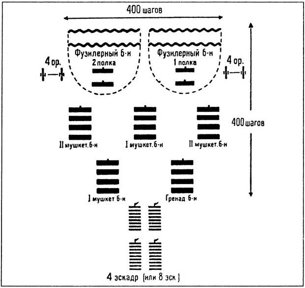 Обычный боевое порядок, принятый почти всеми армиями после Фридриха I, составлял две линии развернутых батальонов с артиллерией на флангах или перед фронтом. За обоими флангами выстраивалась конница, развернув эскадроны в 2—3 шеренги на дистанции 4—5 шагов. Крупные соединения конницы выстраивались в три линии эскадронов. Конница, составляя элемент общего боевого порядка, была прикована к пехоте. Система довольствия — только магазины.
