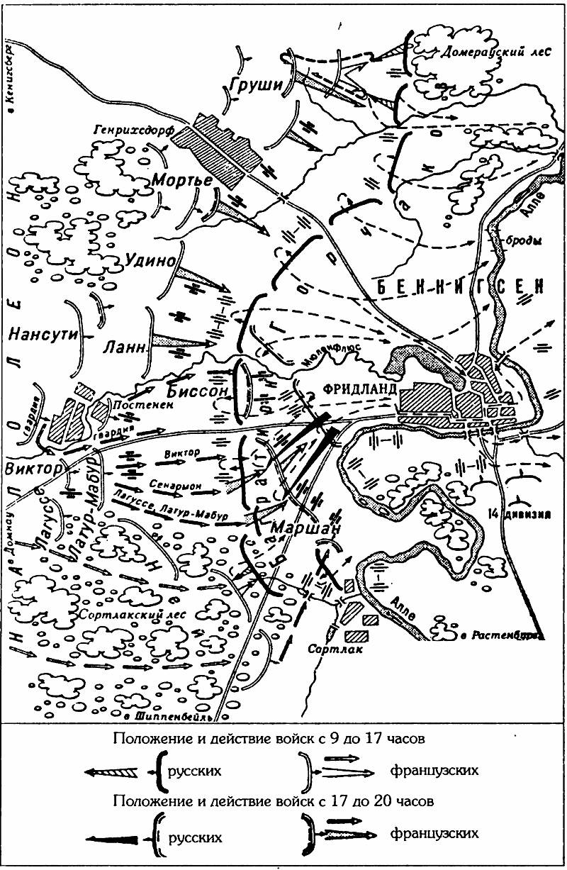 Однако французский полководец не любил повторяться. Желая отрезать русских от Кенигсберга, он, вопреки ожиданиям Беннигсена, предпринял обход его правого фланга, двинув свою армию по левому берегу Алле. В общей численности она к концу боя достигла 115 000 человек,