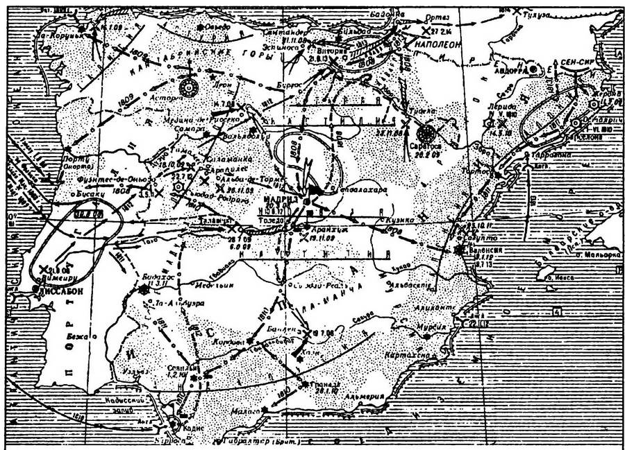 29 октября император покинул столицу; он сам стал во главе армии, двинувшейся в Испанию, чтобы смыть позор Байлена и Синтры. В начале ноября, имея под своим командованием 200 000 человек, Наполеон начал наступление против четырех испанских армий, развернутых на рубеже Эбро. С ним были лучшие солдаты империи: ветераны Маренго, Аустерлица, Иены — его гвардия. Самые прославленные полководцы — Ланн, Ней, Сульт, Бессьер, Сен-Сир — шли под командой императора. Наполеон бросил против Испании все лучшее, что он имел, и уже одно это доказывает, какое огромное значение французский император придавал сокрушению противника, которого вчера еще называл «испанской чернью».