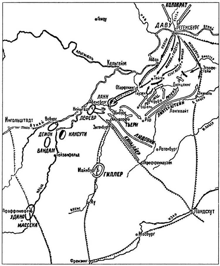 12 апреля вечером, находясь в опере, Наполеон получил известие, что австрийская армия переправилась через Инн и что ее передовые части вступают в Мюнхен. Что ж, война была начата, выбора не было, и Наполеон написав еще несколько писем во все концы света, в три часа ночи сел в походную коляску, лошади помчали его на восток. 18 апреля он был в Ингольштадте, где принял на себя непосредственное руководство операциями. Наполеон сразу же, исходя из обстановки, стал сосредотачивать свои войска в ударный кулак. Он приказал Даву двигаться вдоль правого берега Дуная к Абенсбергу, оставив в Регенсбурге только один полк для удержания переправы через реку. Этот маневр Даву должен был привести к усилению центральной группировки и, помимо того, привлечь на себя внимание австрийцев, угрожавших изолированному корпусу Лефевра. Массена было приказано перейти в наступление во фланг и тыл австрийцев через Фрейзинг,