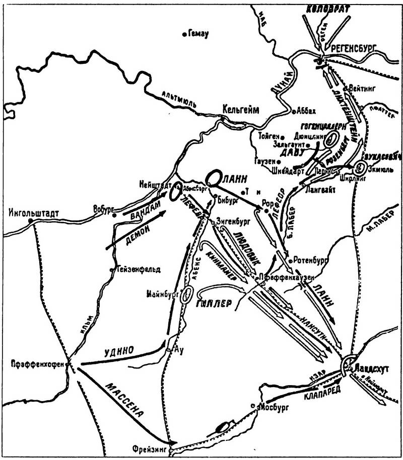 Поэтому у австрийского главнокомандующего, до которого доносились звуки артиллерийской пальбы с ландсхутского направления, даже не возникла мысль оставить против Даву небольшой заслон и с остальными силами броситься с севера на центральную группировку Наполеона. Карл считал, что главное сражение ведет именно он.
