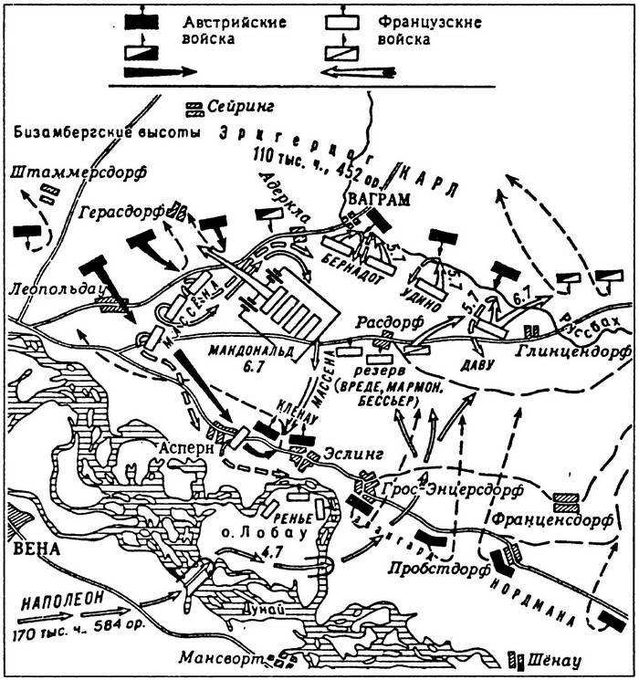 С этого момента в руках Наполеона оказался плацдарм на левом берегу Дуная. Вся армия мощным потоком хлынула по мостам на противоположный берег. Поняв, что сбросить французов в Дунай не удастся, эрцгерцог принял решение обороняться на очень выгодной рус-(бахской позиции, которая в умелых руках могла стать неприступной...
