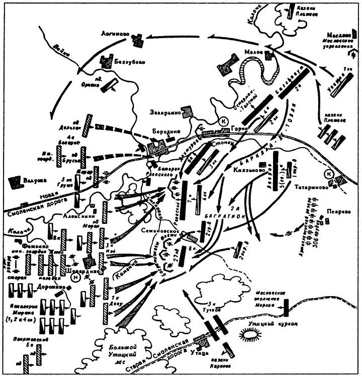 лагерь. Там шло какое-то движение и доносился долгий гул. В середине дня французы узнали, что Кутузов объезжает войска, что по лагерю провозят вывезенную из Смоленска икону Смоленской Богородицы. Наполеон подъехал к Шевардинскому редуту и поинтересовался у генерала своей свиты: «Сколько вчера взято в плен русских?» — «Они не сдаются в плен, государь!» — «Не сдаются? Хорошо, так мы будем их убивать!» — сказал Наполеон и поехал дальше. Он был простужен и неважно себя чувствовал. Вечером император ушел в свою палатку, но не спал сам и не давал спать своим адъютантам. Каждые час-полтора он выходил посмотреть: не ушел ли Кутузов? Видны ли огни на русских биваках? Огни горели. Кутузов не снимался с места. Внезапно Наполеон спросил у дежурного генерала Раппа: «Верите ли вы в завтрашнюю победу?» — «Без сомнения, Ваше величество, но победа будет кровавая». В постель император так и не ложился. Уже светало. Наконец, в палатку явился ординарец от маршала Нея, который спрашивал повеления, начинать ли бой, так как уже пробило 5 часов утра. Русские стоят на месте. Наполеон вскричал: «Наконец, мы их держим! Вперед! Откроем ворота Москвы!» Заря занялась, туман рассеялся, блеснул первый луч солнца. «Это солнце Аустерлица!» — воскликнул император.В войсках зачитывался приказ, в нем говорилось: «Воины! Вот сражение, которого вы так ждали. Победа зависит от вас. Она необходима для вас, она доставит нам все нужное: удобные квартиры и скорое возвращение в Отечество. Действуйте так, как вы действовали при Аустерлице, Фридланде, Витебске, Смоленске. Пусть позднейшее потомство с гордостью вспоминает о ваших подвигах в сей день. Да скажут о каждом из вас: он был в великой битве под Москвою!»