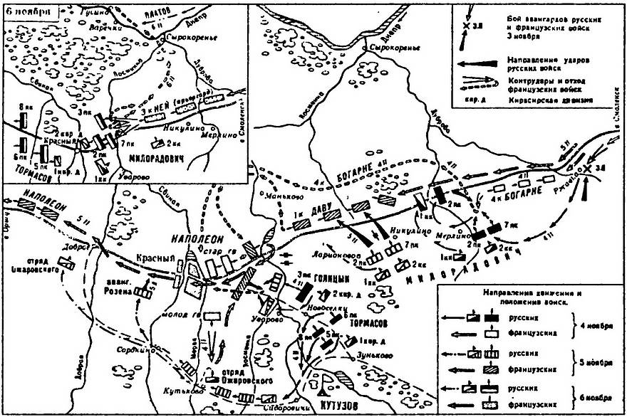 удар противнику во фланг. Авангарду Милорадовича в составе двух пехотных и двух кавалерийских корпусов поручалось нанести удар в тыл. Другими словами, предполагалась осуществить концентрический удар по двум-трем корпусам противника. Однако эта диспозиция не была выполнена.Когда колонна Тормасова двинулась в обходной путь, а колонна Голицына выдвинулась к Уварово, на Смоленской дороге показался корпус Даву — 7500 человек при 15 орудиях. Артиллерия 2-го русского корпуса начала обстрел противника, а пехота уже готова была перейти в атаку. Но Милорадович, основываясь на полученной директиве от Кутузова, приказал пропустить части Даву в Красный. Дело в том, что фельдмаршал дал возможность противнику продвинуться к Красному, чтобы затем зажать его между двух огней и принудить к капитуляции. В свою очередь, когда Наполеон услышал канонаду за Красным, то решил отвлечь на себя внимание русских, чтобы смог прорваться Даву. Французская гвардия обрушилась на войска колонны Голицына в деревне Уварово. Сначала французам удалось выбить русских, но далее 3-й пехотный корпус остановил атаку противника. Превосходящие силы русской артиллерии подавили огонь французских пушек.