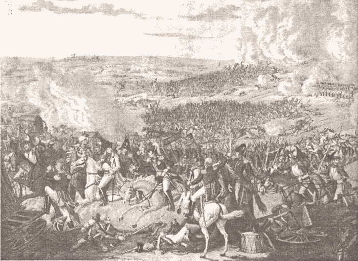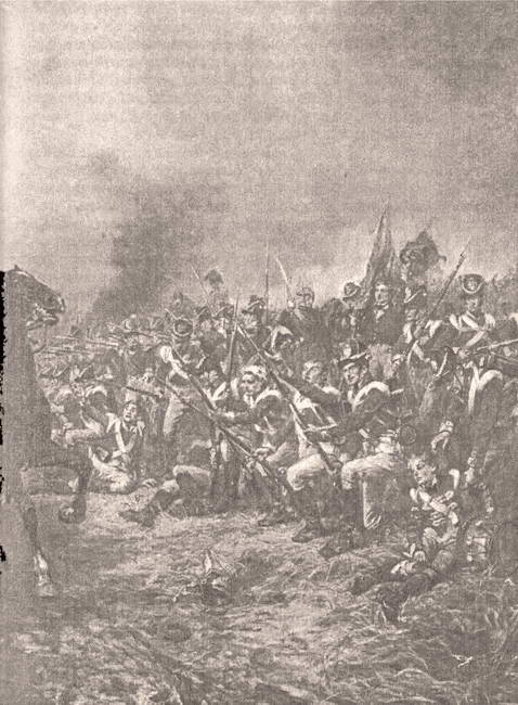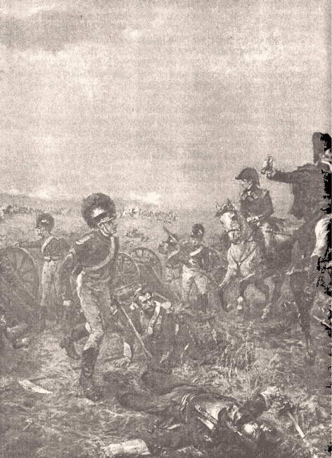 Англичане встретили гвардию страшным огнем артиллерии с фронта и с фланга. Солдаты падали десятками, но не замедляли шага, лишь плотнее смыкая ряды и еще громче крича: «Виват император!» Наконец два батальона взошли на взлобье Мон-Сен-Жана, и перед ними из высоких колосьев пшеницы встала стена сомкнутых рядов английских гвардейцев. Первый их залп скосил несколько сот человек — половину двух батальонов, второй залп, третий... Французские гвардейцы остановились, смешались, стали отступать. Раздался крик: «Гвардия отступает!»
