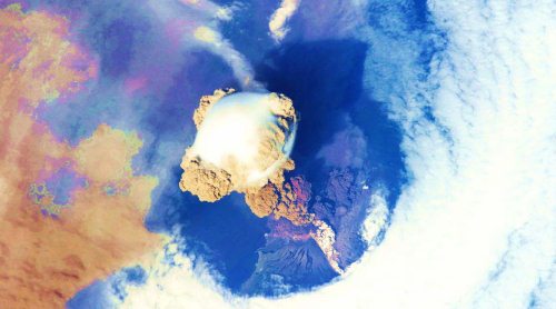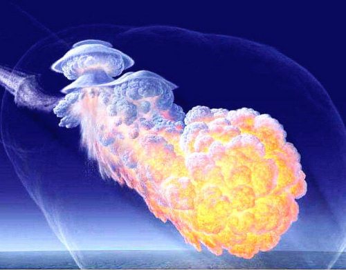 Ударные волны возникают не только благодаря деятельности человека. Вверху: компьютерная реконструкция Тунгусской катастрофы, произошедшей над сибирской тайгой в 1908 г. Метеорит (точнее — метеороид) представлял собой ядро неплотного льда весом порядка миллиона тонн. В правой верхней части рисунка видно, что еще при полете ядра в сравнительно разреженном воздухе образовалась УВ (конус ее справа вверху). При входе в более плотную атмосферу, выделение тепла стало столь интенсивным, что метеороид взорвался, сформировав более мощную и иной формы УВ, которая свалила и сожгла лес на площади более 2000 кв. км. Размеры «бурелома» позволили спустя полвека оценить энерговыделение процесса: оно оказалось таким же, как и при взрыве 20 миллионов тонн тринитротолуола. Внизу: после взрывного извержения курильского вулкана Пик Сарычева, в нагретых прошедшей ударной волной облаках конденсированные частицы воды вновь превратились в прозрачный пар, благодаря чему появилось «окно», через которое из космоса и было сфотографировано явление. Известный человечеству рекорд взрывного энерговыделения, произошедшего на поверхности Земли принадлежит вулкану Кракатоа: при извержении 1883 г., он был оценен, как эквивалентный пяти миллиардам тонн тринитротолуола. В воздух при этом было выброшено около 6 кубических километров пепла, а выродившаяся в акустическую ударная волна была слышна на удалении 4800 км.
