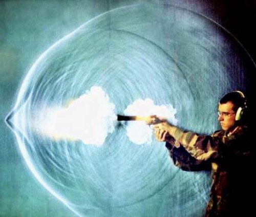 Слева — выстрел из револьвера «Магнум» и образование при этом ударных волн. Внешняя, сферическая сформирована воздухом, вытесненным из ствола пулей, а внутренняя, также сферическая — пороховыми газами, вырвавшимися из ствола; конические ударные волны образованы летящей пулей. Плотность энергии внешней волны убывает с расстоянием, УВ замедляется. Видно, что впереди стрелка внутренняя УВ догнала и усилила внешнюю, заставив ее двигаться быстрее. Скорость ударной волны всегда превышает скорость звука в невозмущенной среде, где она распространяется, и обгоняет УВ звук тем заметнее, чем выше давление в ее фронте. Если это давление незначительно, то такую волну называют вырожденной: она мало чем отличается от акустической. В центре: глушитель, укрепляемый на стволе, значительно ослабляет звук выстрела: пороховые газы, сообщив вылетевшей из ствола пуле скорость, далее не расширяются свободно, а «расплываются» в отсеках глушителя: летящая пуля последовательно «открывает» для них все новые отсеки, в каждом последующем из которых давление меньше, чем в предыдущем. Когда пуля вылетает из глушителя, газы выходят из него уже с небольшой скоростью, не образуя ударную волну. Справа: 155-мм самоходная гаубица ведет огонь с использованием глушителя, громкий звук выстрела не демаскирует орудие