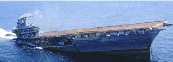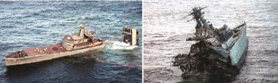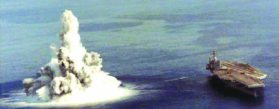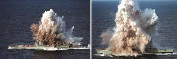 Испытания стойкости крупных кораблей к подводной ударной волне. Верхний снимок: модельный опыт воздействия ударной волны в воде на авианосец «Констеллейшн» (постройки 60-х годов). ВВ в этом опыте взорвали много (более тонны), но и расстояние до объекта значительно (для сравнения: длина авианосца — треть километра). Нижний снимок: авианосец «Орискани», построенный в годы Второй мировой войны, подобного испытания не выдержал