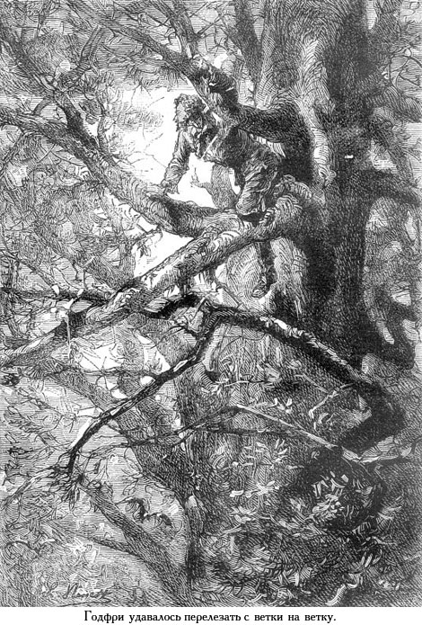 Дрожа от волнения, Годфри стал спускаться. Добравшись до нижнего разветвления, он на минуту остановился, набрал мху и хвои, затем, опустившись в люк, пробитый молнией, тщательно, как только мог, заделал его. Добравшись наконец до земли, Годфри бросил на ходу несколько слов Тартелетту, чтобы тот не беспокоился, и быстрым шагом направился к побережью.
