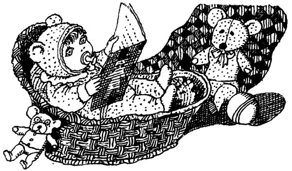 Самый юный член нашей семьи, грудной младенец, лежит, допустим, в своей кроватке. Естественно, в нашей семье читает даже такой малыш. У него, как и у всех остальных, в руке книга, только она поменьше и полегче, чем книги старших, — такая специальная книга для грудных детей. Другой ручкой он сжимает бутылочку с детской смесью, поскольку его задача, к которой он относится исключительно серьезно, состоит в том, чтобы хорошенько питаться, — он должен вырасти большим и сильным, чтобы впоследствии читать книги побольше и потяжелее. Но, если быть точным, то, что он держит в руке, собственно говоря, не совсем его бутылочка, а скорее пузырек чернил. Но малыш, слава богу, не пьет из него, а только время от времени выплескивает несколько капель себе на голову. Это ему ничуть не мешает, и лишь когда жирная чернильная клякса наконец падает на страницу, которую он в данный момент пробегает глазами, карапуз начинает требовать (а я надеюсь, никто не сомневается в том, что наше ученое дитя умеет разговаривать):