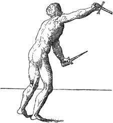 Как практический человек, автор здраво рассудил, что первую стойку принимают, когда обнажают меч: в тот век, если случалось драться, никто не придерживался пустяковых формальностей, и обнажить меч и занять стойку значило выполнить одно действие.