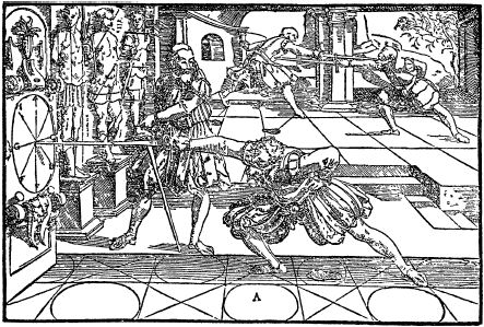 Рис. 44. Фехтование на рапирах в немецких школах около 1570 года. Мейер
