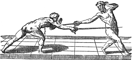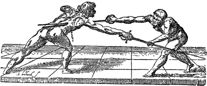 Противники принимают свои contra postura вне дистанции и, осторожно наступая друг на друга, оказываются в пределах misura larga. Они стараются никогда не приближаться к misura stretta без того, чтобы не сделать либо укол, либо финт, чтобы остановить неизбежный укол в оппозиции. «При любых атаках, – говорит Фабрис, – остерегайтесь наносить укол слишком сильно и перенапрягаться», – эта предосторожность еще важнее в бою громоздкой рапирой, чем с легкими современными шпагами.