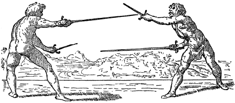 2. Добрый фехтовальщик, дерясь, всегда должен уметь во время защиты ответить уколом, но не должен продолжать и наносить удар, не будучи уверенным, что сможет парировать контрудар. Он не должен отстраняться, не выполнив удара в то же время, а если защищается кинжалом, то должен следить за тем, чтобы бить мечом в тот же миг, когда кинжал делает защитное движение.