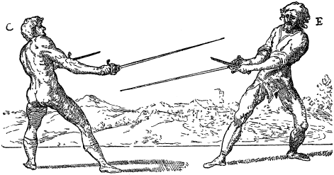 Однако при моей стойке нужна только одна предосторожность – держать оружие прямо перед собой и прикрывать «слабую» часть клинка противника, чтобы иметь над ней преимущество, не прикасаясь, вплоть до того момента, когда будет выполнен укол снаружи или внутри, смотря по обстоятельствам».