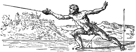 Рис. 65. Капо Ферро, 1610 год. «Фигура, изображающая стойку, как принято в нашем искусстве, и невероятное увеличение дальности путем botta lunga [116] – при атаке все члены тела двигаются сообща»