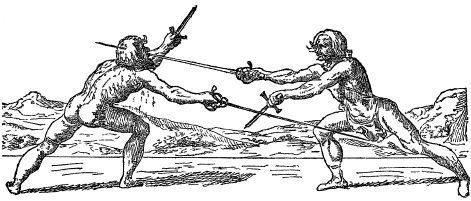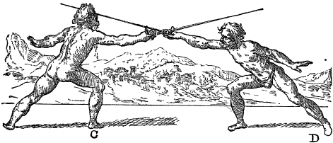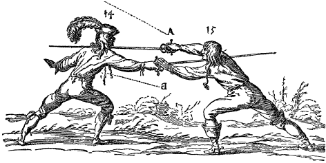 «Легко может произойти так, что ваш противник, кружа вокруг вас, окажется с внутренней стороны вашего меча, в таком случае вы должны сделать перевод и отодвинуться в сторону. Когда он попытается снова получить преимущество, вы должны снова сделать перевод и уколоть в кварте с выпадом».