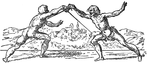 12. Вы должны знать, что, когда ваш противник отводит острие от линии, вы должны немедленно направить свое острие прямо в его кисть. Слегка наклонившись назад, можно добиться безопасной дистанции, а получив ее, нанести укол в mezzo tempo в его руку, бросив корпус вперед и согнув правое колено.