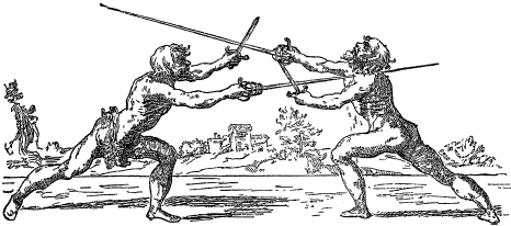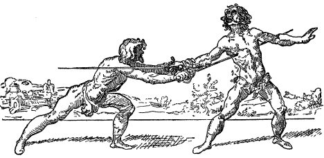 13. Выполнив укол с длинным шагом, правой ногой вперед, одним мечом или мечом и кинжалом или плащом, нужно отступить назад коротким шагом, согласно тому, сколько сзади места. Если его мало, должно только переставить назад правую ногу и следовать мечом за мечом противника. Если же, наоборот, места много, должно сделать два коротких шага назад, чтобы с последним шагом возвратиться в стойку. Это единственно верные способы отступления, хотя в школах применяют и другие».