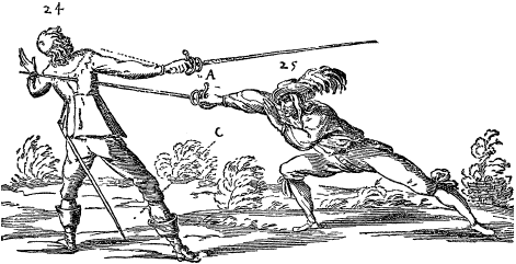 Рис. 70. Альфьери, 1640 год. Figura che ferisce sotto la spada nimica, di contratempo, senza parare, solo con l'abassar la vita. Укол с оппозицией на перевод оружия противника с наклоном ниже его острия. Фехтовальщик под цифрой 25 также имеет возможность сделать укол в лицо или riverso в колено противника
